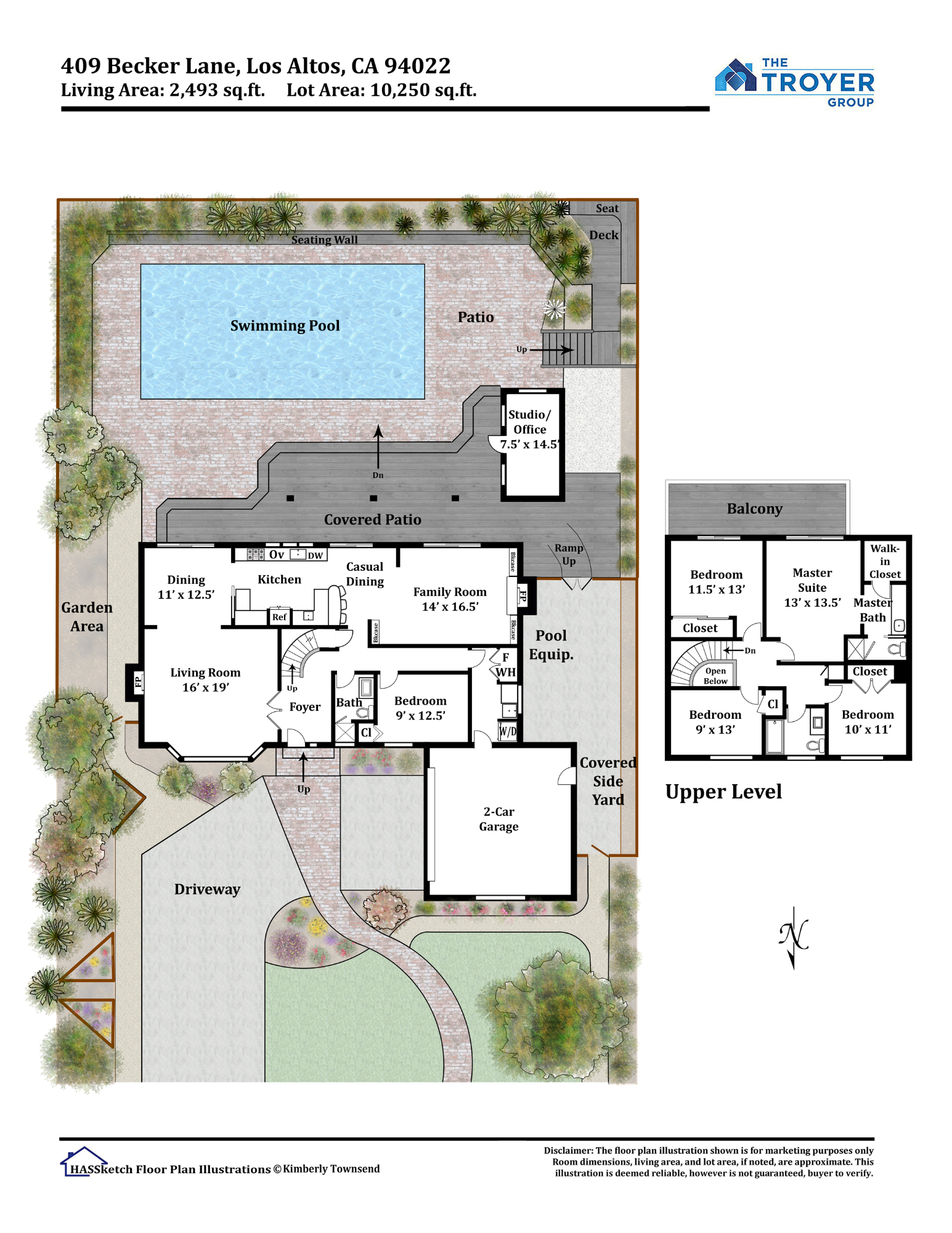 Sitting on a prime cul-de-sac in North Los Altos with easy access to downtown amenities and acclaimed schools, this spacious and light-filled home has an ideal floor plan, updated finishes, a wonderful rear yard and pool, and a detached studio or office. The front yard boasts drought-tolerant landscape, mature trees, and a welcoming brick pathway to the entrance. Inside, gorgeous hardwood floors start in the living room with vaulted ceilings and continue through the dining room, kitchen, and family room. The kitchen is well placed between the dining room and family room with a granite bar on each end for effortless entertaining. Guests can enjoy a private main-level bedroom, while 4 additional bedrooms including the roomy master suite sit on the 2nd level with access to a balcony with views of Black Mtn. The backyard features a covered deck, a pool surrounded by a brick patio, terraced garden beds, and a shaded patio. A true gem, backing to one of the last remaining apricot orchards!