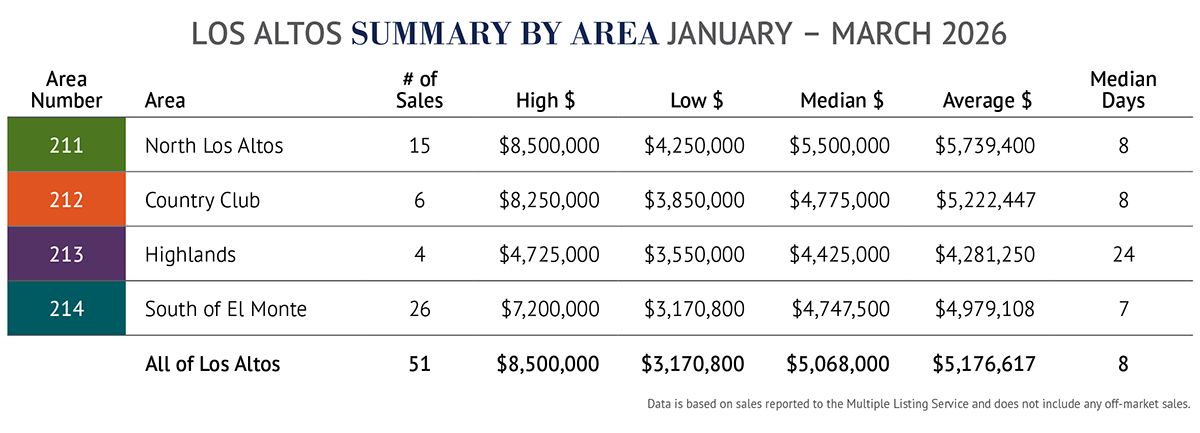 As we reported to you at the beginning of the year in our annual report (find it on the Market Data tab at troyercabot.com), we anticipated continued demand in 2026, which is exactly what we saw. Q1 2026 did see noticeable volatility in the financial markets, with meaningful swings driven by geopolitical events, energy shocks, and shifting economic expectations. As a result, it’s too early to determine how this may affect our local market going forward. Real estate in Los Altos remains highly sought-after, and limited inventory continues to support strong pricing. Buyers may become more cautious, but the fundamentals of the local market – top schools, a thriving community, and proximity to major tech employers – remain key drivers of demand.