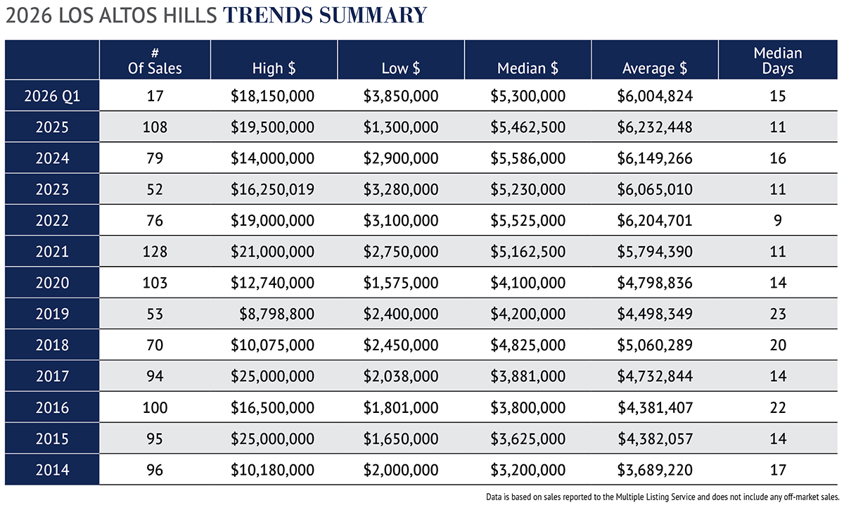 As we reported to you at the beginning of the year in our annual report (find it on the Market Data tab at troyercabot.com), we anticipated continued demand in 2026. We still see demand for this highly desirable area, however the stats were influenced by the noticeable volatility in the financial markets and meaningful swings driven by geopolitical events, energy shocks, and shifting economic expectations. As a result, it’s too early to determine how this may affect our local market going forward. Real estate in Los Altos Hills remains highly sought-after, and limited inventory continues to support strong pricing. Buyers may become more cautious, but the fundamentals of the local market – top schools, a thriving community, and proximity to major tech employers – remain key drivers of demand.