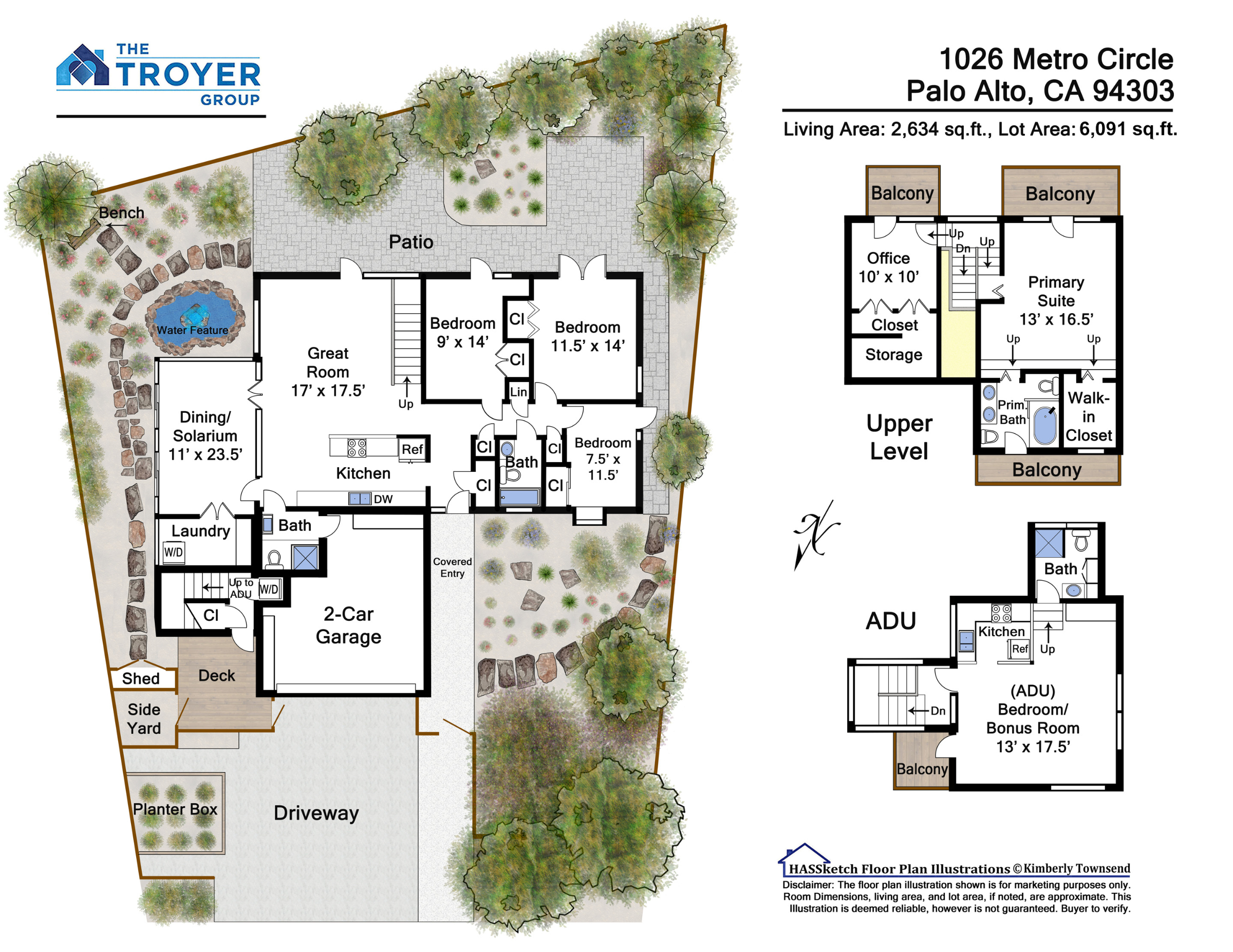An incredible opportunity to move-in and enjoy, remodel, or customize a spacious Eichler home and ADU in the heart of the Metro Circle Midtown neighborhood. The main house includes three main-level bedrooms and two full baths, a spacious living room with garden access, open-concept kitchen, dining room solarium, and upper-level primary suite with two private balconies and an adjacent home office. Accessible via its own gated entrance, the ADU features a large light-filled living area, kitchenette, full bath and in-unit laundry. Wrapping around the home, perfectly shaded patios are surrounded by fresh landscaping, mature trees, sitting areas, and a water feature. Located just moments from 22-acre Greer Park, all of the amenities at Midtown Shopping Center, acclaimed Palo Alto schools, and fabulous restaurants. Limitless potential to make it your own, with separate guest accommodations or possible rental unit!