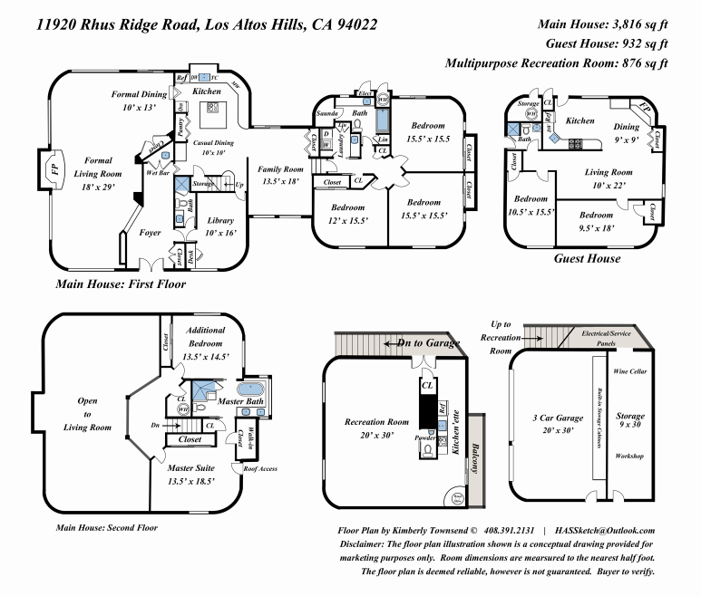 - The master quarters, (roughly a 40’x20′ area) is currently divided into two large rooms: a master bedroom and an office. A master bath joins them on one side and the balcony/landing on the other.