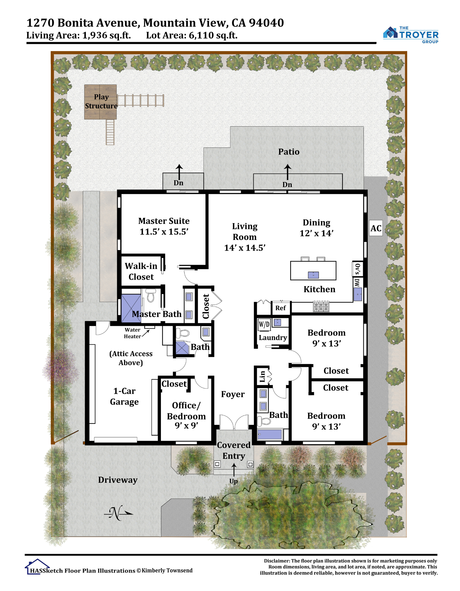 - Wonderful rear yard with relaxing concrete patio, play structure, mature perimeter plantings providing privacy, concrete hot tub pad with wiring, and direct gated access to the Bubb Elementary schoolyard