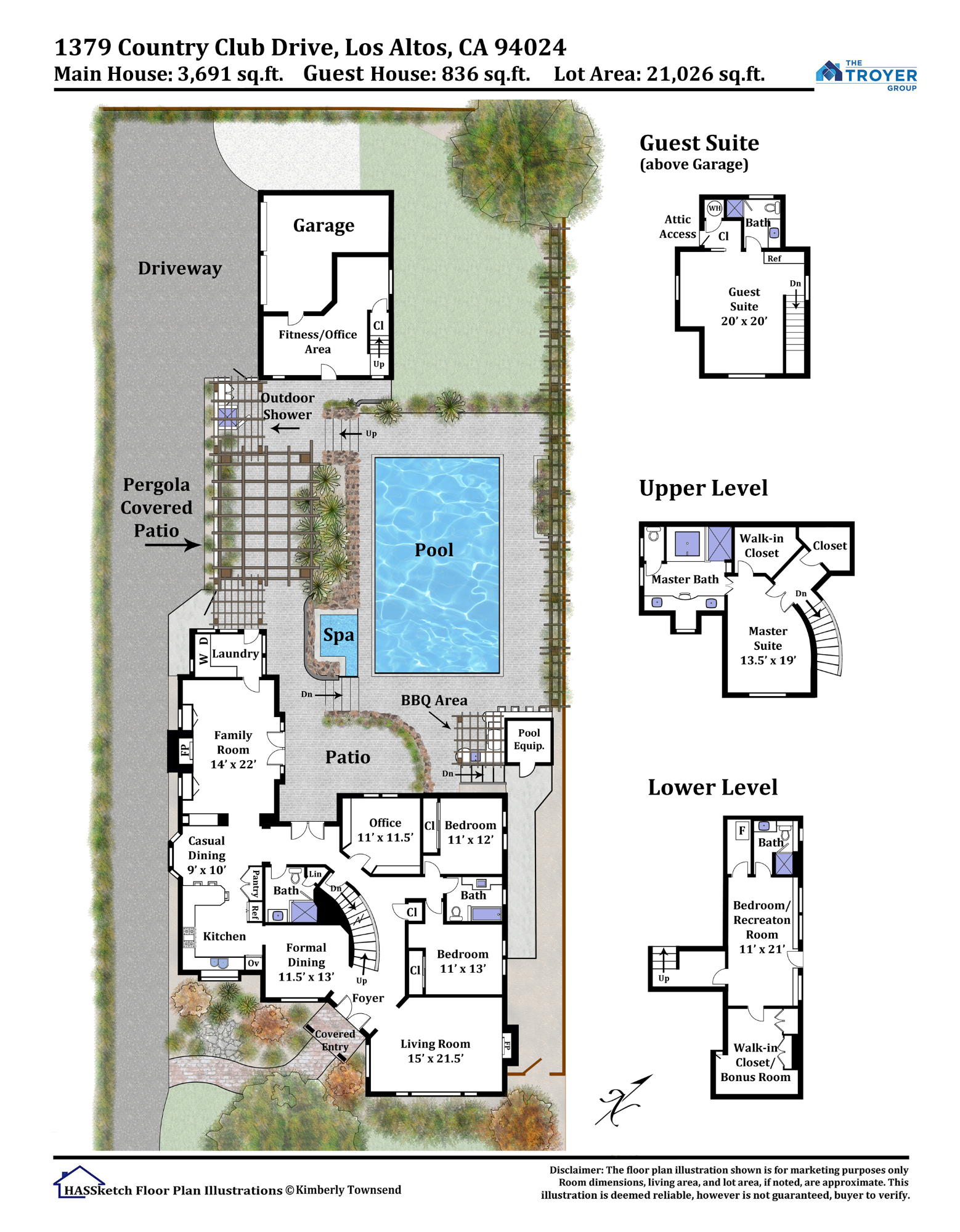 • An approximately 3,691 square foot main house, plus a 836 square foot guest house, for a total of 4,527 square feet of living space