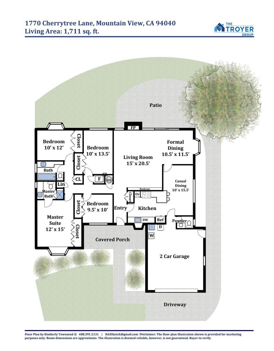 - Freshly landscaped, large wraparound yard is shaded by a mature Zelkova tree and features a paved patio and walking path, level lawn, storage shed, raised vegetable beds, plus access to outdoor electric outlets for convenient lighting options