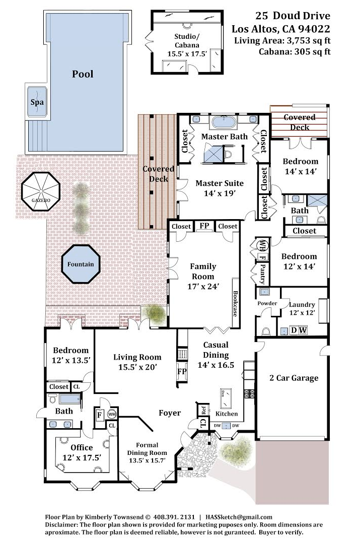 - Pool-side studio cabaña perfect for an art studio or playroom; carpeting, extensive built-in cabinetry, two skylights, and two sets of French doors are featured