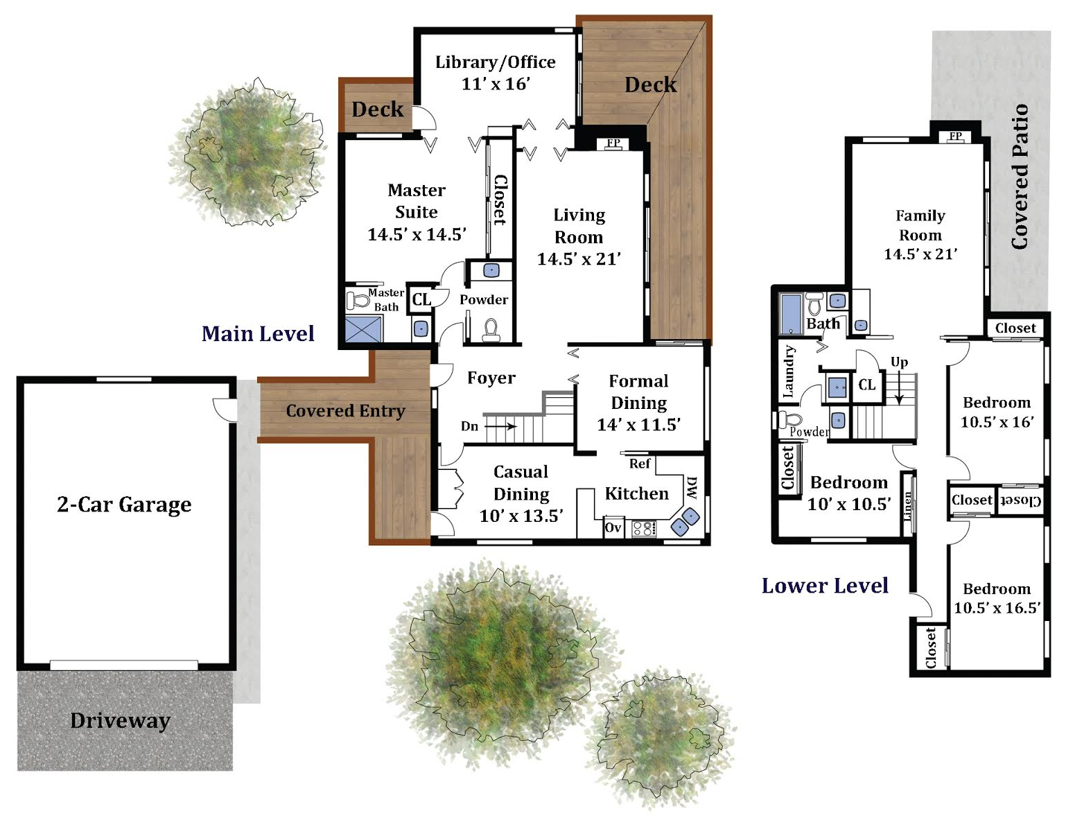 - Two-level country home with 5 bedrooms, 2 full baths, and 2 half-baths