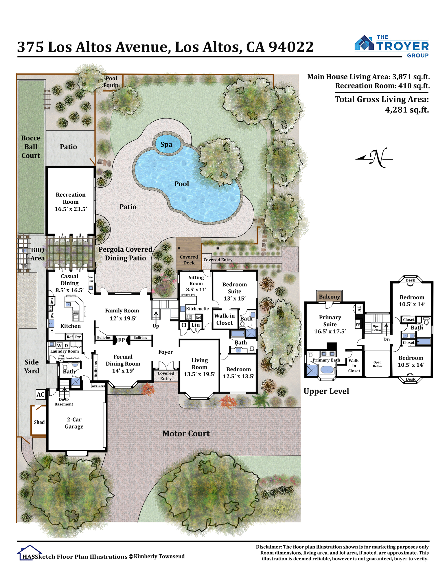 | Comfortably accommodate a multi-generational, growing family. The main level presents spacious living spaces that open to the resort-style grounds with a pool, spa, bocce court, and vast patios that provide the perfect venue for fun-filled gatherings and year-round family enjoyment. The chef’s kitchen boasts striking black quartz countertops, high-end appliances, and a casual dining area that opens directly to the outdoor kitchen and pergola-covered dining patio, plus the detached recreation room with soaring vaulted ceilings. Also on the main level, a self-contained suite has a lovely sitting room and kitchenette, and a quiet executive office overlooks the front yard. On the upper level, two bedrooms enjoy substantial built-in workstations, while the primary suite features a gas fireplace, private balcony overlooking the pool, and a travertine-appointed ensuite. Luxe indoor/outdoor family living! |