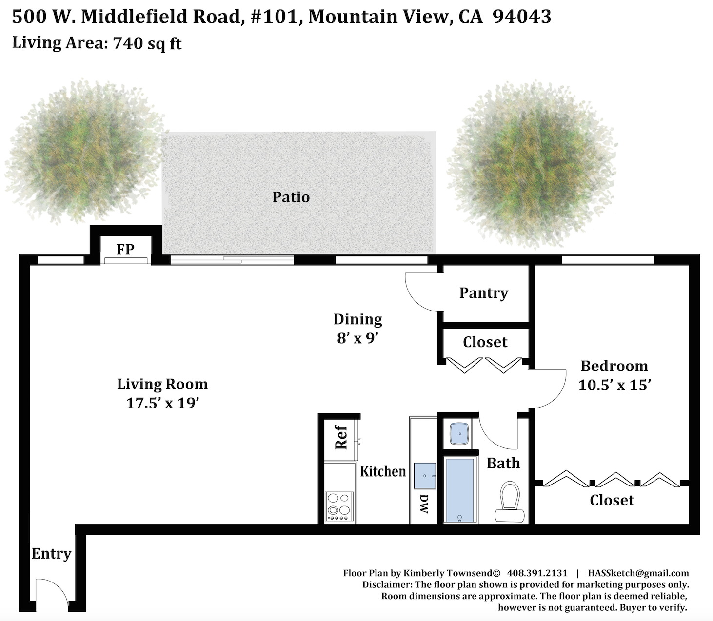 • A wide sliding glass door in the living area opens to a very private patio that spans the rear of the home beneath two towering evergreen trees; a fireplace is outlined in new tiles