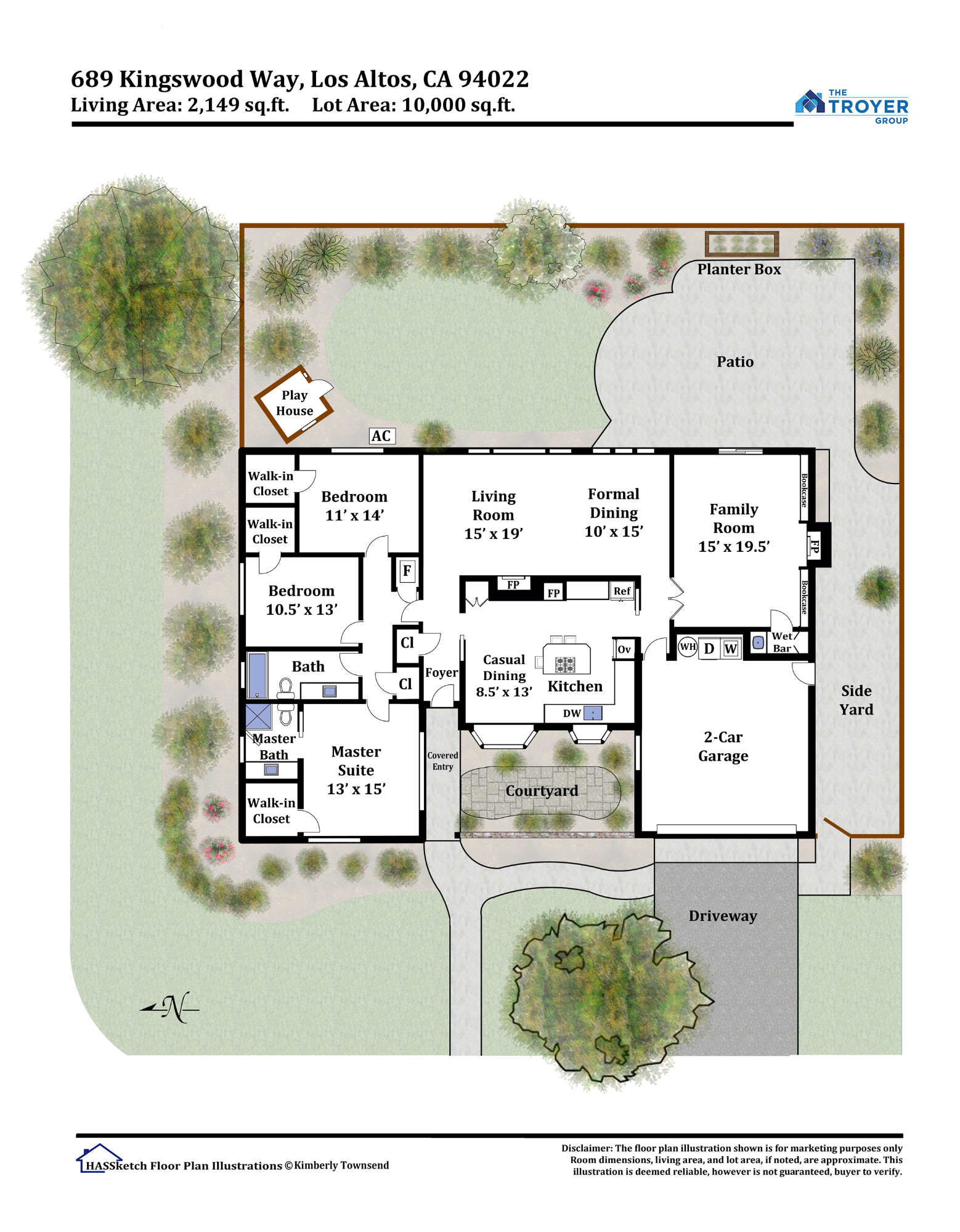 • Private, tranquil rear yard with stretch of lush lawn, charming playhouse, entertaining patio, and perimeter plantings