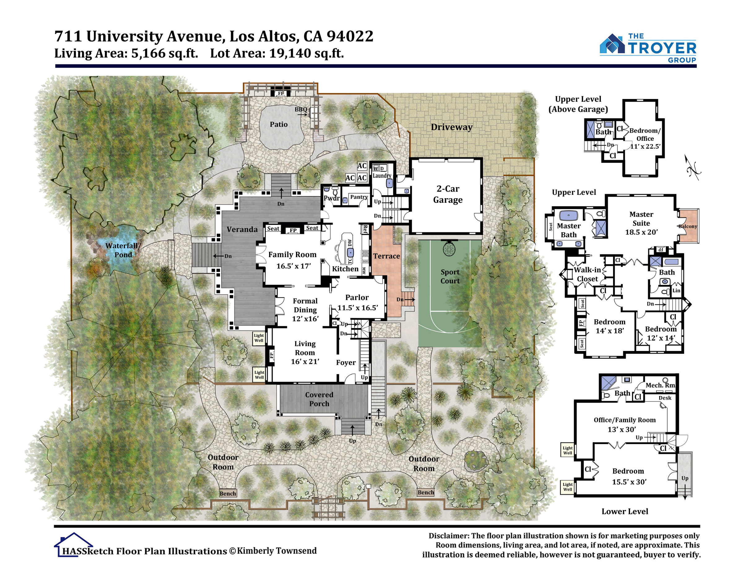 - Every inch of the property is supremely utilized with meandering walking paths, perfectly positioned outdoor rooms, lush gardens, pond and waterfall, level lawn, and mature shade trees all completely encircling the home