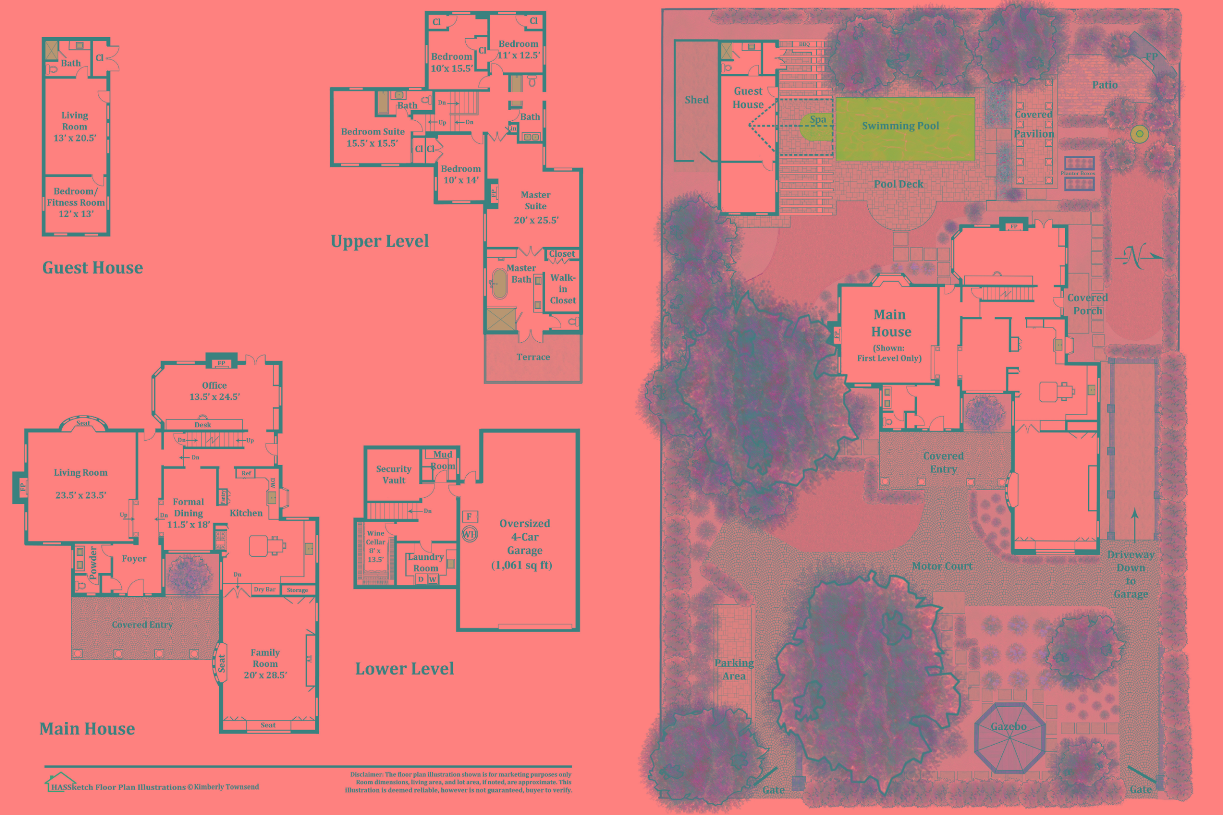 - Approximately 5,427 square foot main house plus 598 guest house, for a total living area of 6,025 square feet