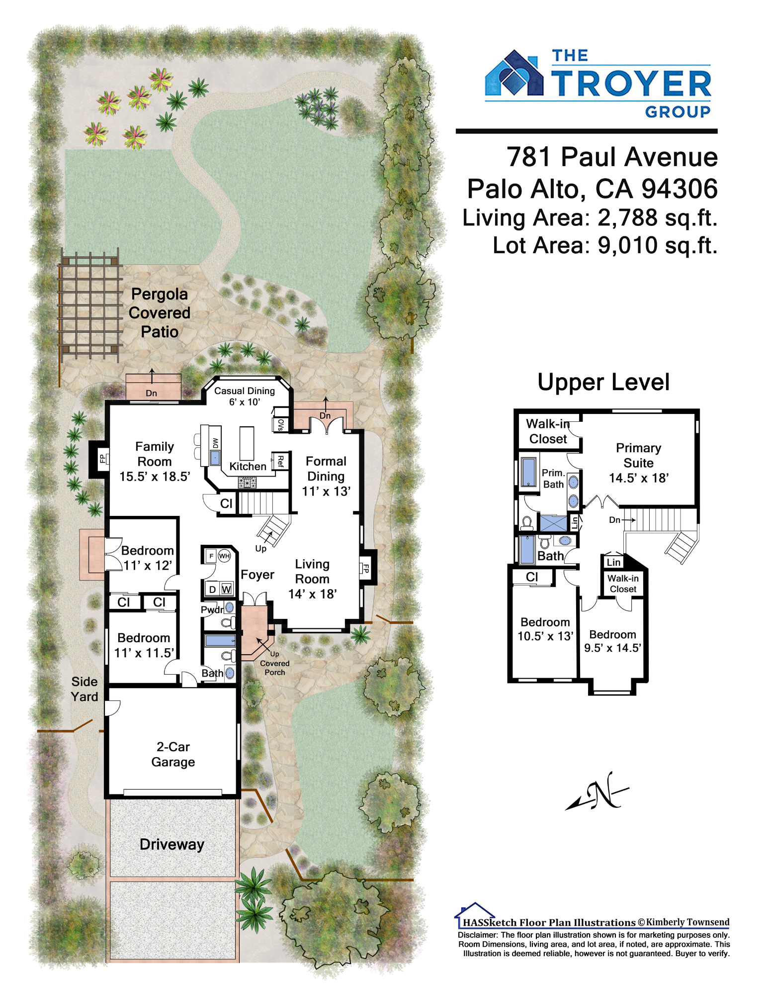 This classic and spacious home, surrounded by private yards originally designed by Mary Gordon, is located in Barron Park, minutes from Stanford and Bol Park. Enter through the fenced front yard to the dramatic and light-filled two-story foyer. Then, a living room with vaulted ceilings and a marble fireplace leads to an entertainer’s dining room with French doors to the yard. The eat-in kitchen overlooks striking bougainvillea, and a generous family room opens to the outdoor entertaining space. Two main-level bedrooms, could serve as offices, or in-law quarters with their separate French door entrance and full bath. Upstairs, two bedrooms enjoy arched windows, while the expansive primary suite has a walk-in closet and a marble ensuite with a jacuzzi. Outside, your private outdoor oasis includes a large flagstone patio, meandering pathways, tall hedging, mature shade and fruit trees, and a pergola. Close to top-rated schools, trails, and bike paths!