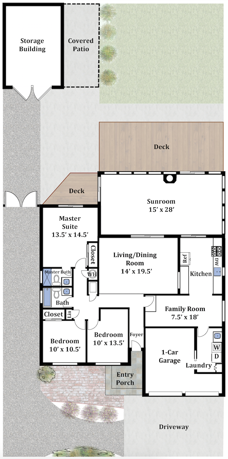 - Attached, oversized 1-car garage with storage, plus circular driveway for off-street parking